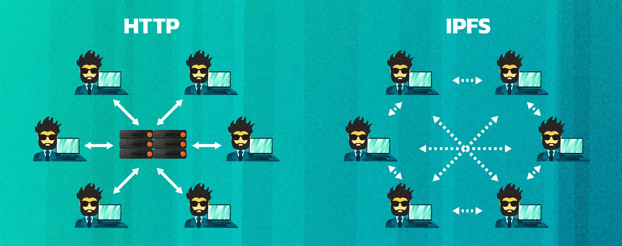 In contrast, technologies such as IPFS utilize purely peer to peer transfer of data. Each file is hosted across a network of connected nodes which each participate independently of each other. In addition, these files use content-based addressing to alleviate the problems of location and revisions. In a similar fashion to the torrents used to share music or movies, these decentralized files are hard to stop, without access to every participating node in the network.