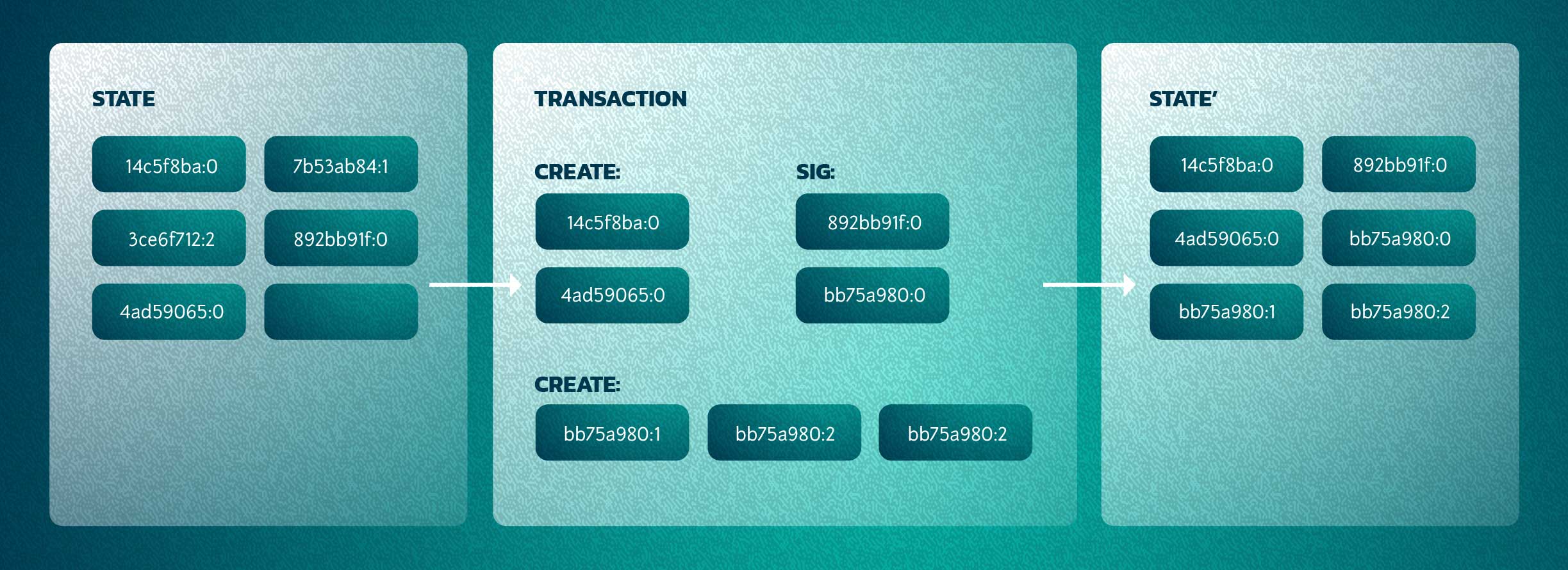 Because Ethereum is a complete virtual machine, and not simply a data block like Bitcoin, it is possible to store more complex information, and even manipulate it. In particular, when a new address is created on the network, as shown above, the network uses a state transition event to track the changes.